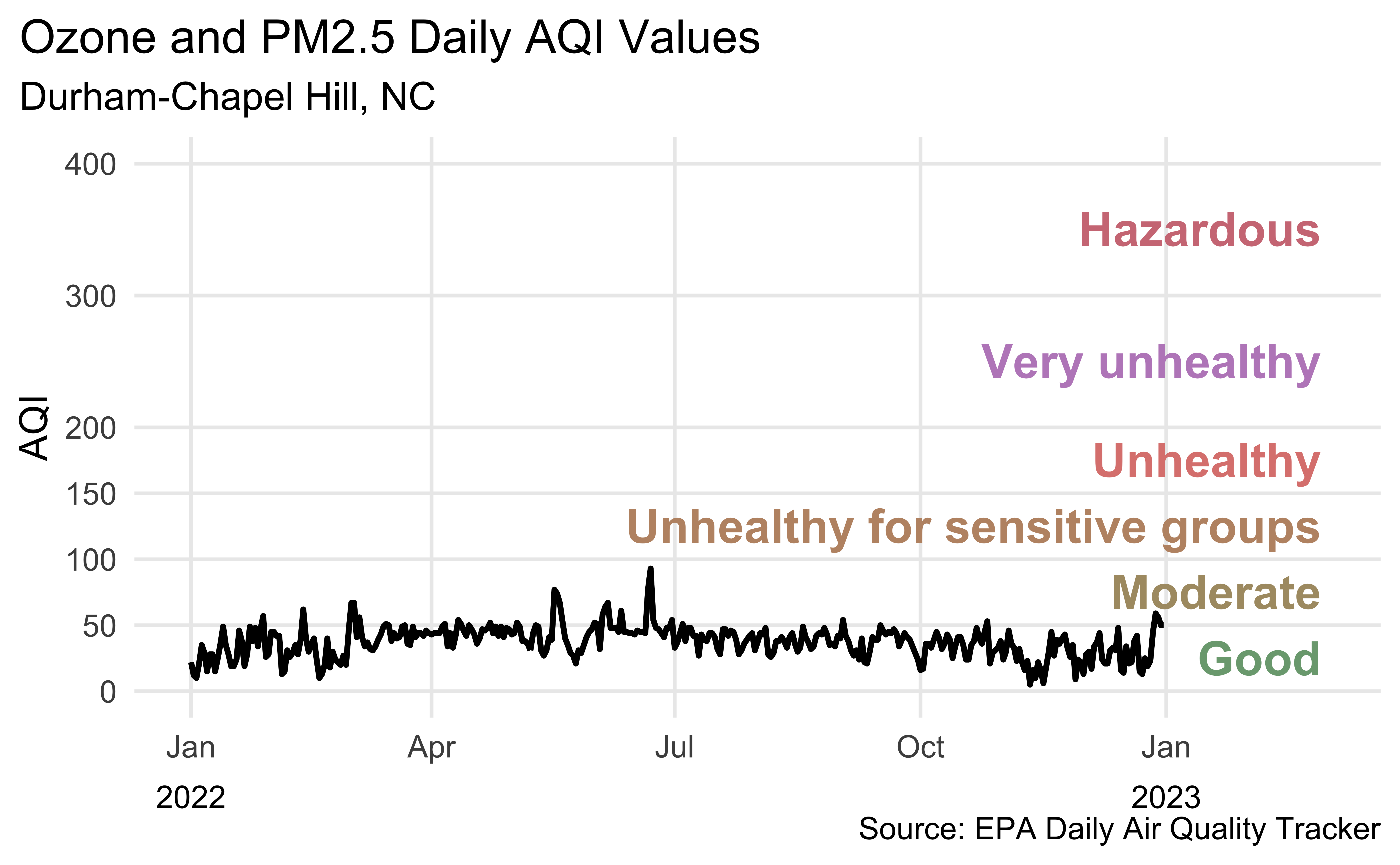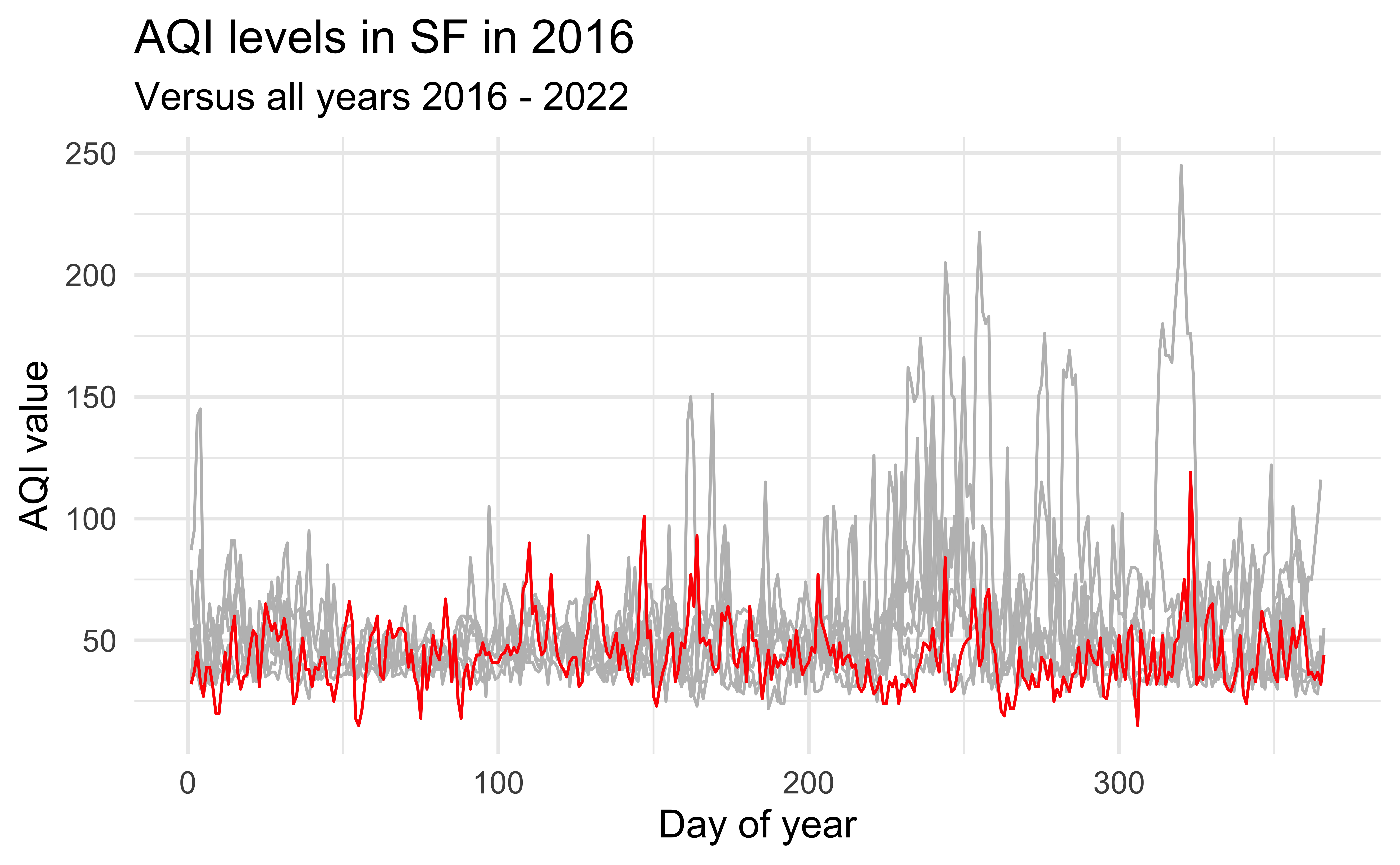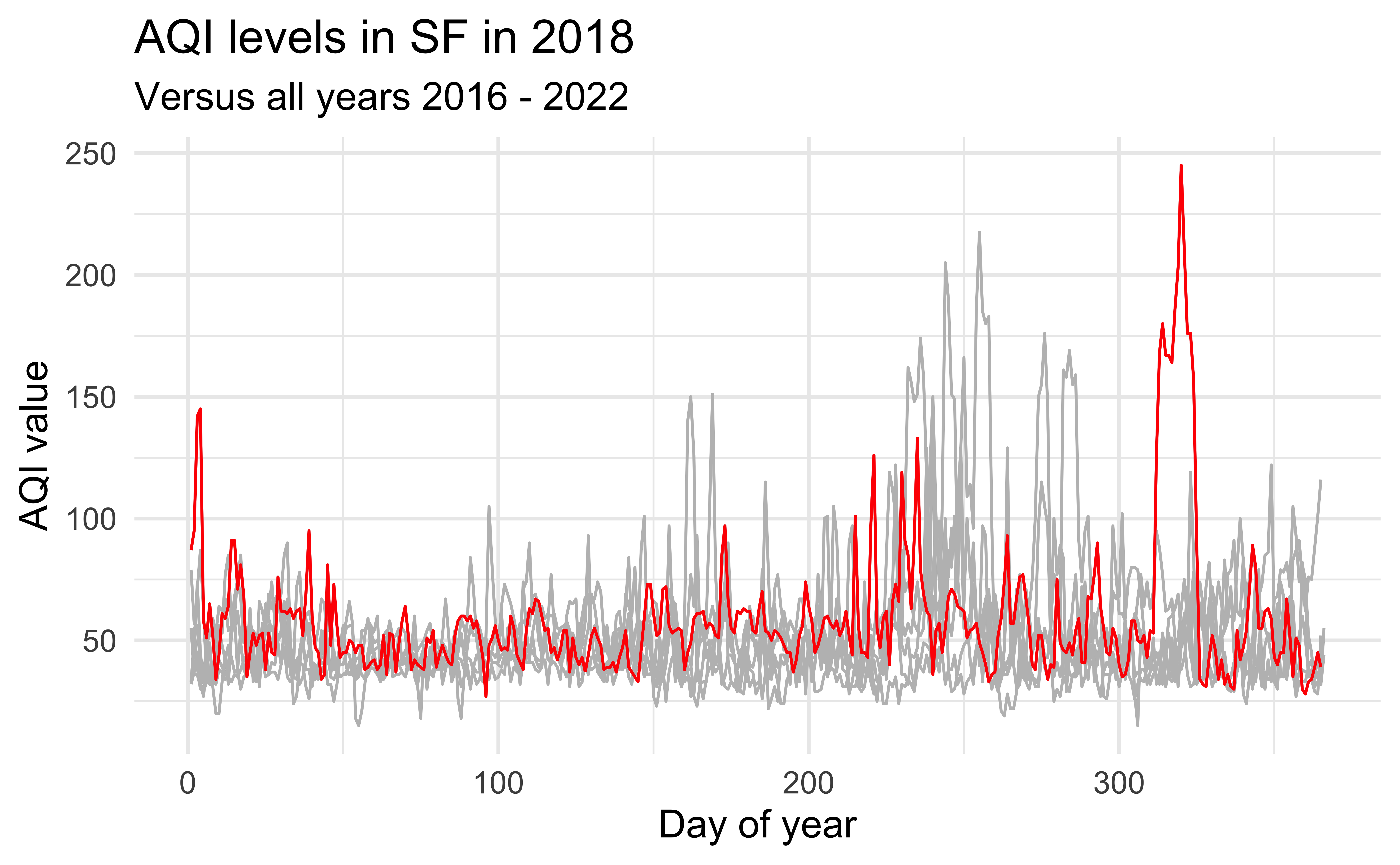 year_to_highlight <-2018ggplot(sf, aes(x = day_of_year, y = aqi_value, group = year)) +geom_line(color ="gray") +geom_line(data = sf |>filter(year == year_to_highlight), color ="red") +labs(title =glue("AQI levels in SF in {year_to_highlight}"),subtitle ="Versus all years 2016 - 2022",x ="Day of year", y ="AQI value" )year_to_highlight <-2018ggplot(sf, aes(x = day_of_year, y = aqi_value, group = year)) +geom_line(color ="gray") +geom_line(data = sf |>filter(year == year_to_highlight), color ="red") +labs(title =glue("AQI levels in SF in {year_to_highlight}"),subtitle ="Versus all years 2016 - 2022",x ="Day of year", y ="AQI value" )year_to_highlight <-2018ggplot(sf, aes(x = day_of_year, y = aqi_value, group = year)) +geom_line(color ="gray") +geom_line(data = sf |>filter(year == year_to_highlight), color ="red") +labs(title =glue("AQI levels in SF in {year_to_highlight}"),subtitle ="Versus all years 2016 - 2022",x ="Day of year", y ="AQI value" )year_to_highlight <-2018ggplot(sf, aes(x = day_of_year, y = aqi_value, group = year)) +geom_line(color ="gray") +geom_line(data = sf |>filter(year == year_to_highlight), color ="red") +labs(title =glue("AQI levels in SF in {year_to_highlight}"),subtitle ="Versus all years 2016 - 2022",x ="Day of year", y ="AQI value" )