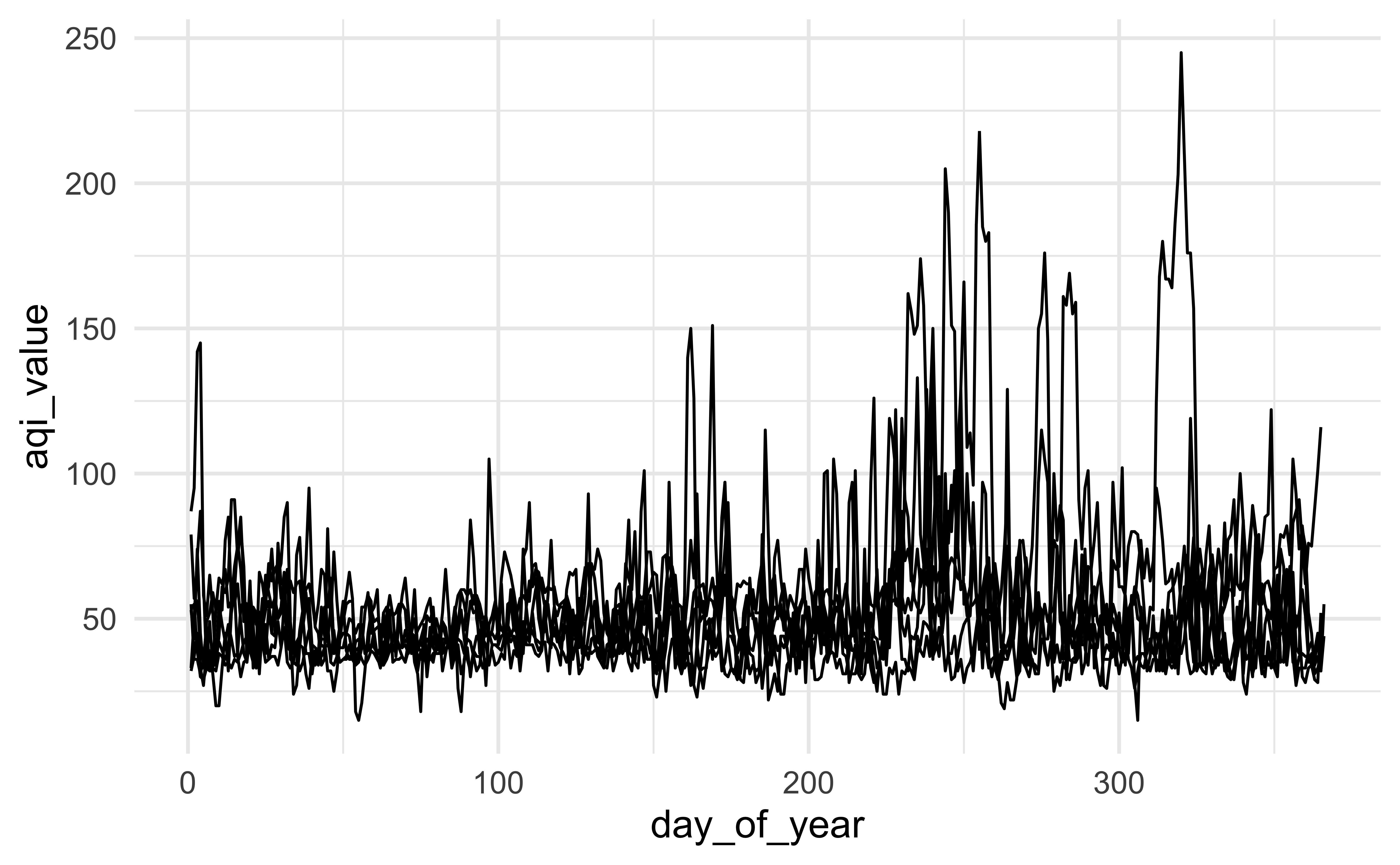 ggplot(sf, aes(x = day_of_year, y = aqi_value, group = year)) +geom_line()