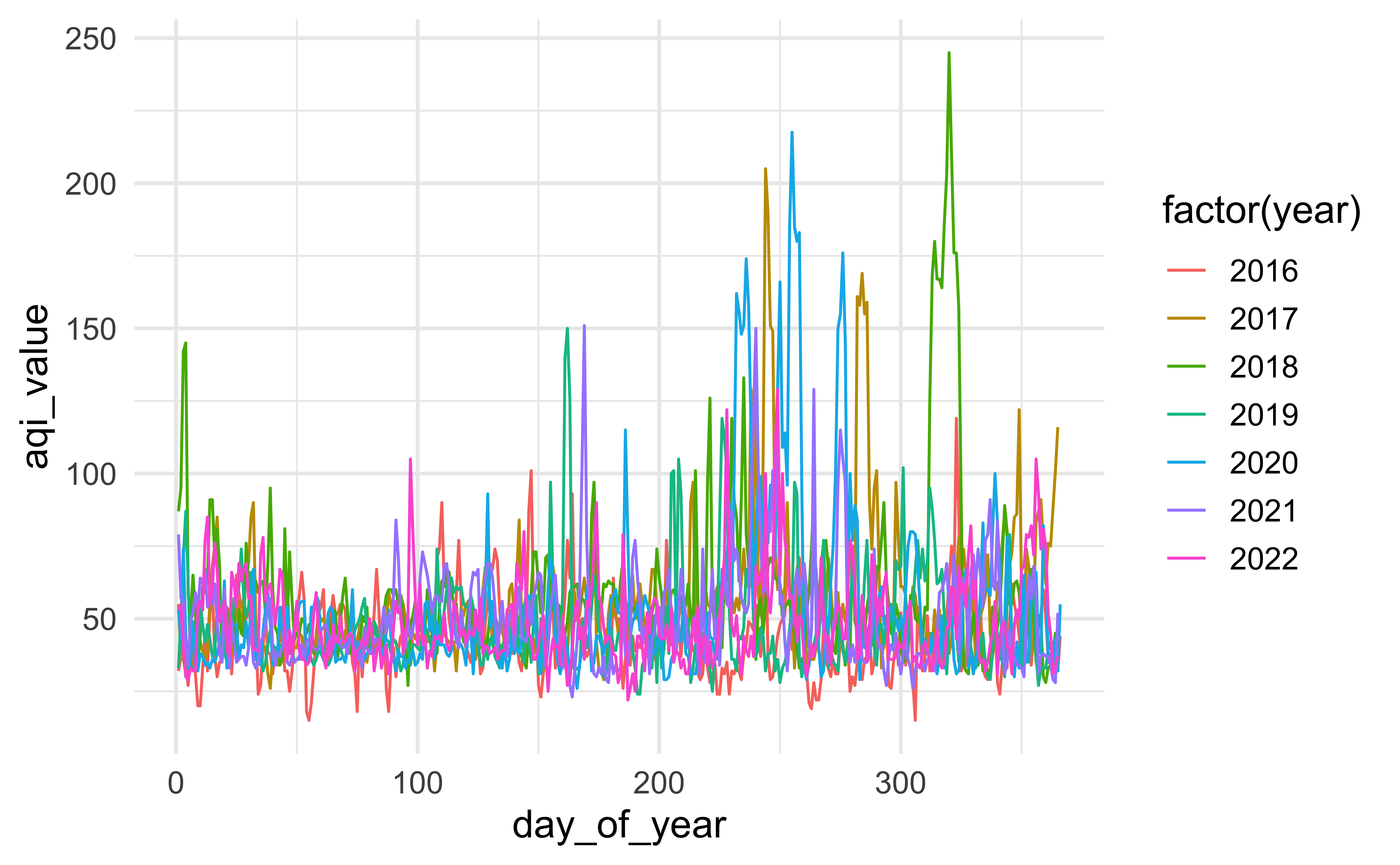 ggplot(sf, aes(x = day_of_year, y = aqi_value, group = year, color = year)) +geom_line()