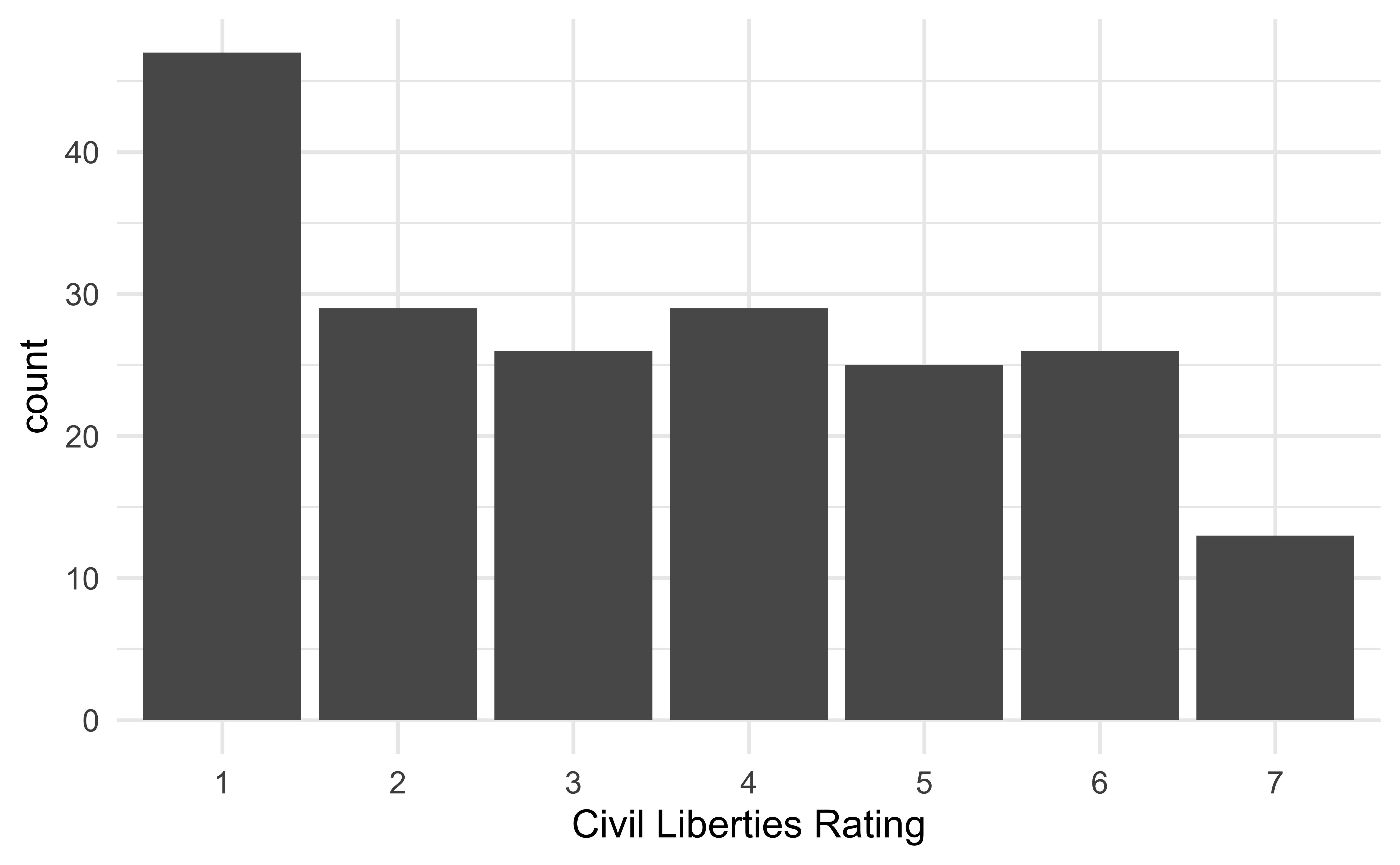 The following visualization shows the distribution civil liberties ratings (1 - greatest degree of freedom to 7 - smallest degree of freedom). This is, undoubtedly, not the best visualization we can make of these data. How can we improve it?